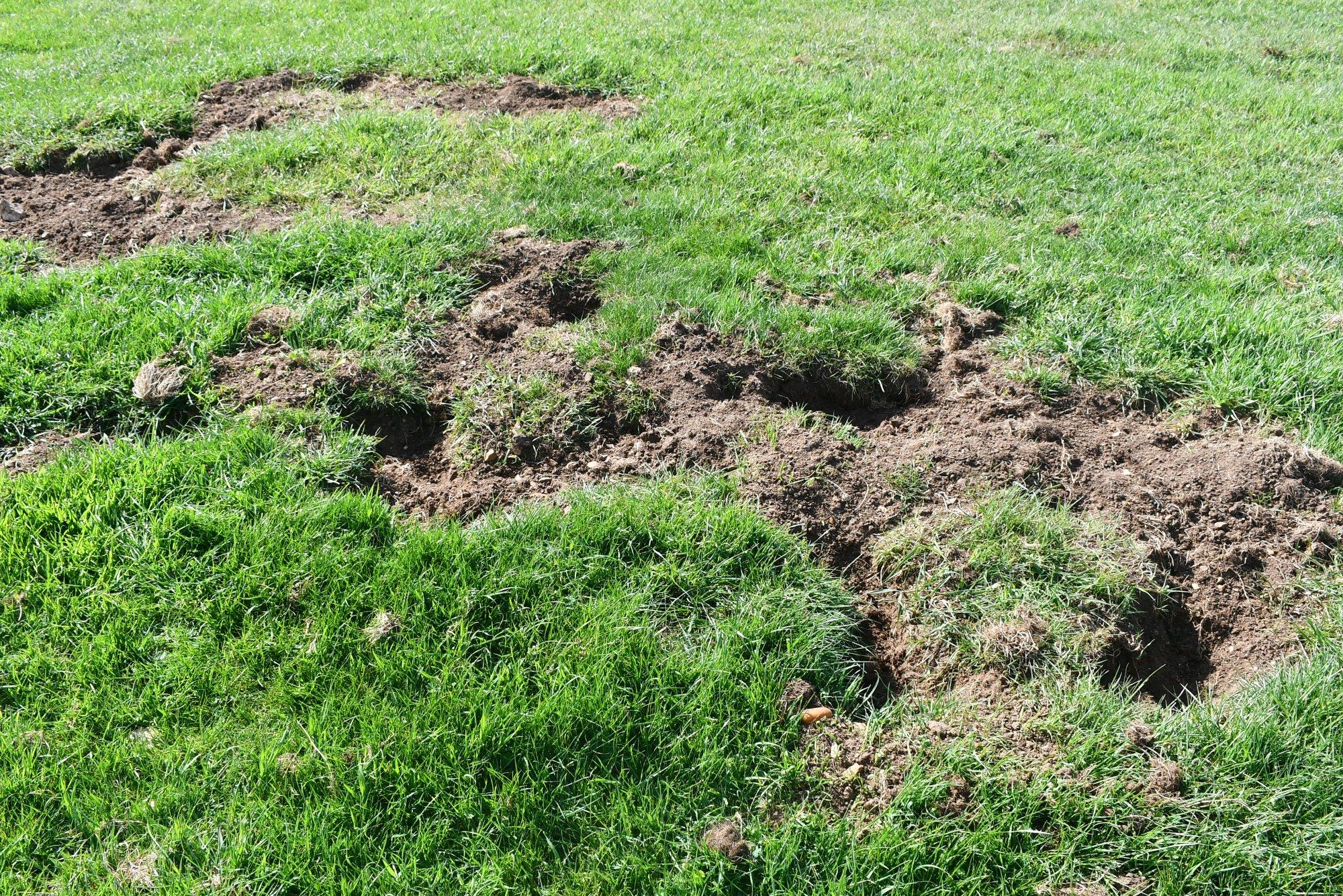 ‘Snuffle holes’ in the ground show where badgers have removed turf to dig out earthworms or other prey.